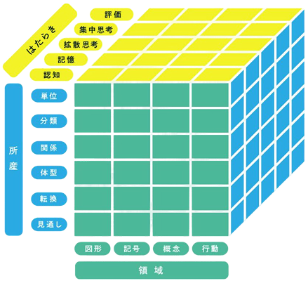 左の図のキューブは「知能因子」に相当し、個々のキューブが「どのような情報(領域)の、どんな性質(所産)を、どのように処理(はたらき)するか」を表しており、英才教室、幼稚園、小学校では、これらの因子に基づいて多角的に考える力を養うことのできるオリジナル教材を作成しています。