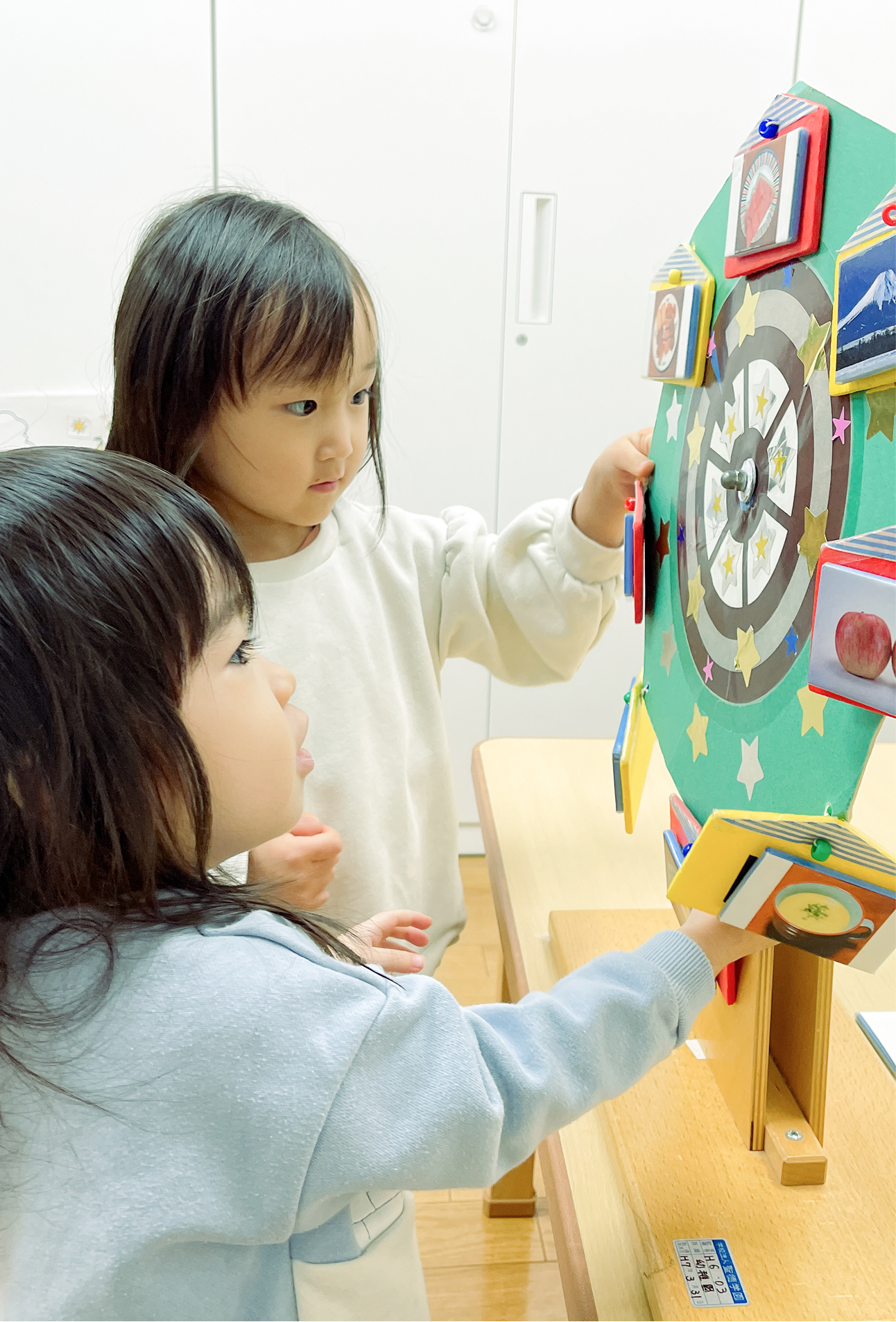 2歳から5歳までの幼児は、遊びの中で自然と考えることを楽しんでいます。そういった子ども達の興味関心を考える力に繋げていけるように英才教室では、手作り教材を使って知能に刺激を与えています。挑戦意欲を高め、興味関心を持ちやすく、夢中になれるように、60の因子に沿った教材を開発して子ども達に与えています。幼児の能力に合わせて段階的に提供し、適切な挑戦機会の中で、達成感や自己肯定感の形成を育んでいけるように取り組んでいます。