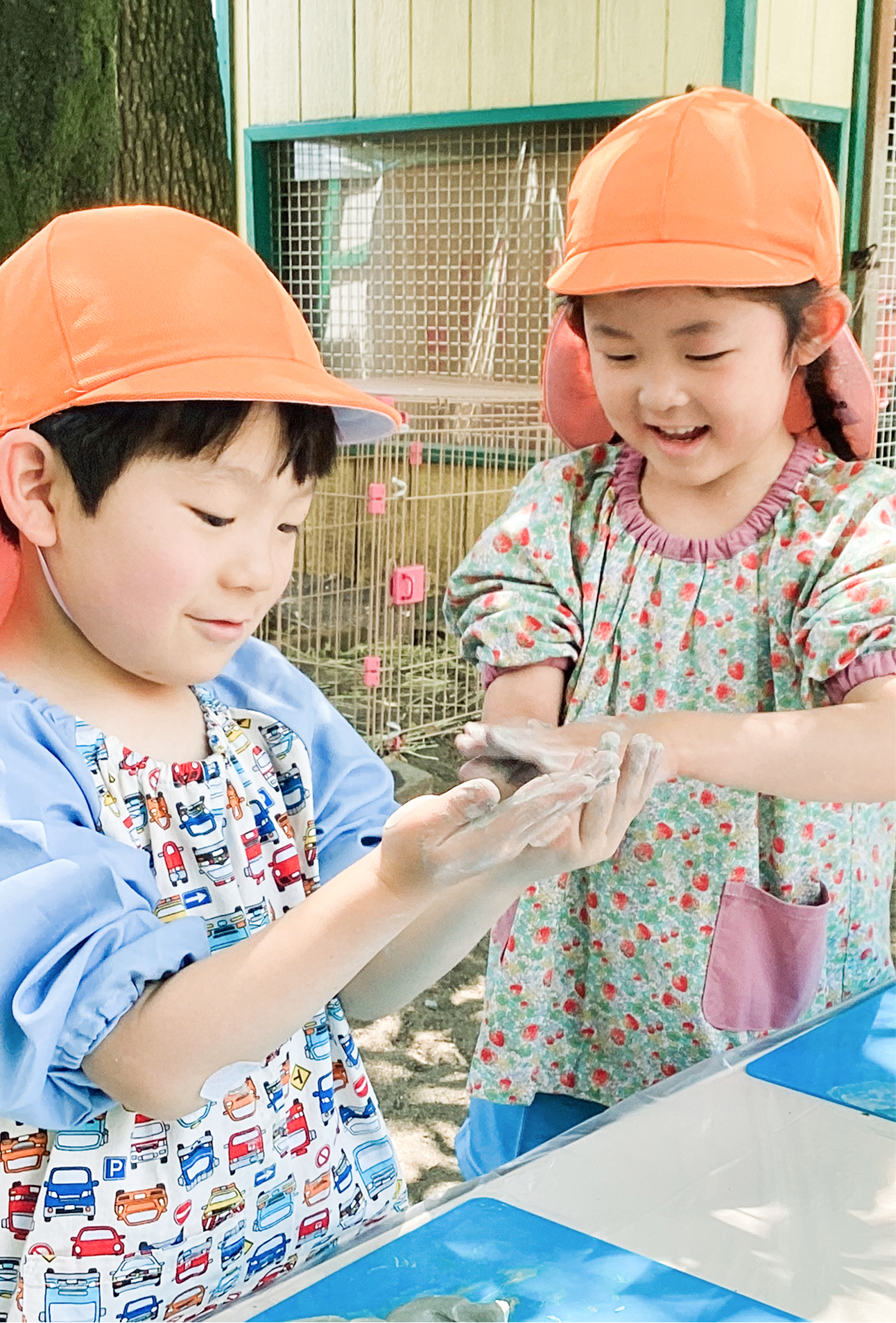 年長さんで"光る泥団子"作りあそびをします。土に水と砂を入れて捏ねていきます。この段階で子ども達は「これで泥が光るのだろうか?」と疑問を持ちはじめます。しかし、固めて撫でると凹凸がなくなり、つるつる感が出てきます。「これって光ってる?」水分も抜け始め、より硬くなりさらに撫でていると「光った!」こうして、「泥団子を光らせる」という成功への一歩を踏みだします。この達成感が「もっと!」という意欲に繋がり「どうしたら?」と考え始め、工夫になりまります。「やりたい!」から始まったあそびで夢中になり、「もっと」の気持ちを達成するために考える姿勢へと発展していく子ども達の意欲を大切にしています。その他のカリキュラムあそびや生活の中においても、子ども達の「やりたい!」に寄り添い「考える力」を伸ばしています。