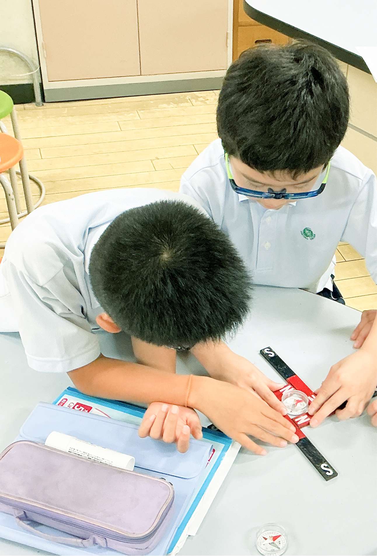 小学校では、教材や授業展開の中に「えっ?」と思わせる仕掛けをすることで、子どもたちの「なんで?」という気持ちを刺激します。この疑問を解決するために、子どもたちは状況を理解し、経験と結びつけ、問題点を洗い出し、対応策を検討します。スムーズに進むこともあれば、友達の意見を参考にしながらさらに考える必要が生じる場合もあります。こうした過程を経て、解答や解決策に到達した時、工夫の詰まった作品に仕上がった時の達成感は、次への「もっと!」という深く学びたいという意欲につながります。小学校が大切にしている「考える力」は、理解して覚えるという力を中心とした学習ではなく、さまざまな知能面を活用した学びの設定です。