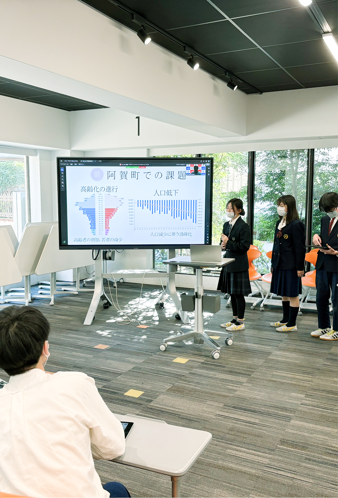 「自らの強みを活かし、世界とつながり、新しい価値を生み出す人」の育成を目標としています。その中心にあるのが「考える力」です。生徒は学習や学校生活の中で対話を通じて、自ら問いを立て課題を見つけ、情報やデータを基に論理的かつ創造的に思索し、人を魅了する表現や実践を通して学びを深めています。